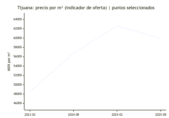 El siguiente gráfico (Mermaid) ilustra una tendencia aproximada del precio por m² en Tijuana usando puntos reportados por el Index de Inmuebles24 difundido por medios (ojo: distintas notas usan distintos meses/cortes).