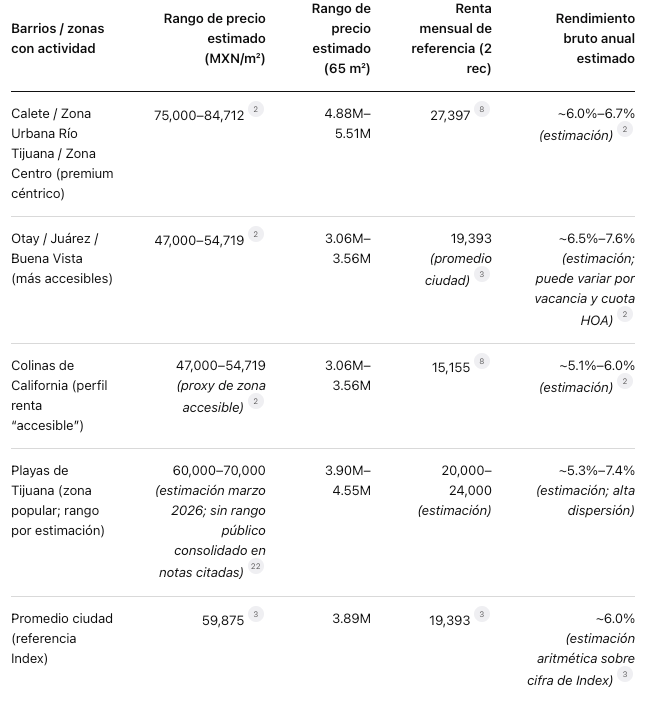 Un punto útil: reportes históricos de portales muestran que Tijuana combina demanda por compra y renta. Por ejemplo, el reporte estatal de Lamudi (corte 2020–2021) muestra valores promedio (anunciados) para Tijuana: casas en venta alrededor de $2.62M (dic 2020) a $2.88M (dic 2021); departamentos en venta de $3.33M a $3.64M; y rentas mensuales de casas $18,600 a $19,700 y departamentos $19,700 a $20,500 en ese periodo.